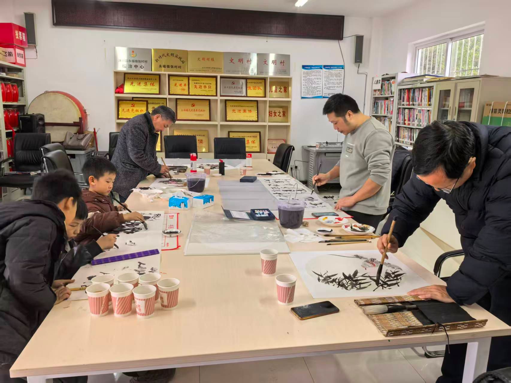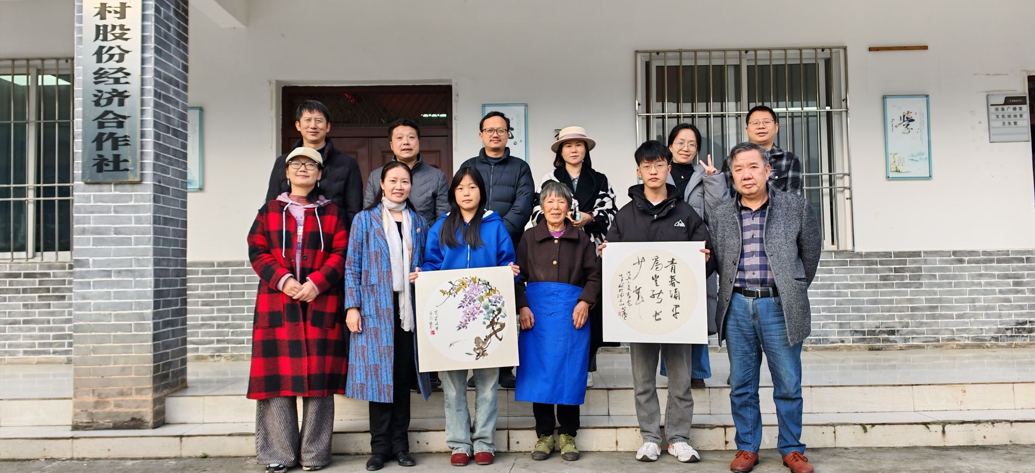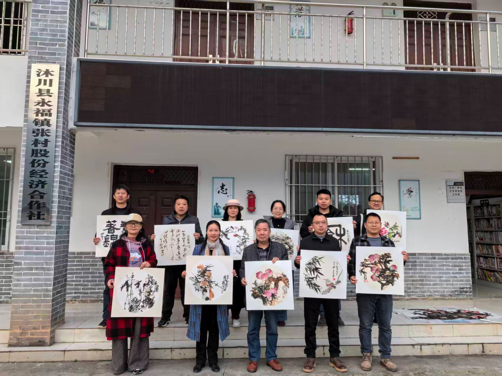 随后,王孝琴一行在张村村开展帮扶慰问活动。在驻村干部的陪同下,王孝琴与熊火花走访结对帮扶的脱贫户,详细了解其生活状况与实际困难,并送去了米、油等慰问品。与此同时,李开能、龚洪林、周文斌等教师代表在张村村村委会现场挥毫创作,为村民送上多幅具有地方特色的书画作品。