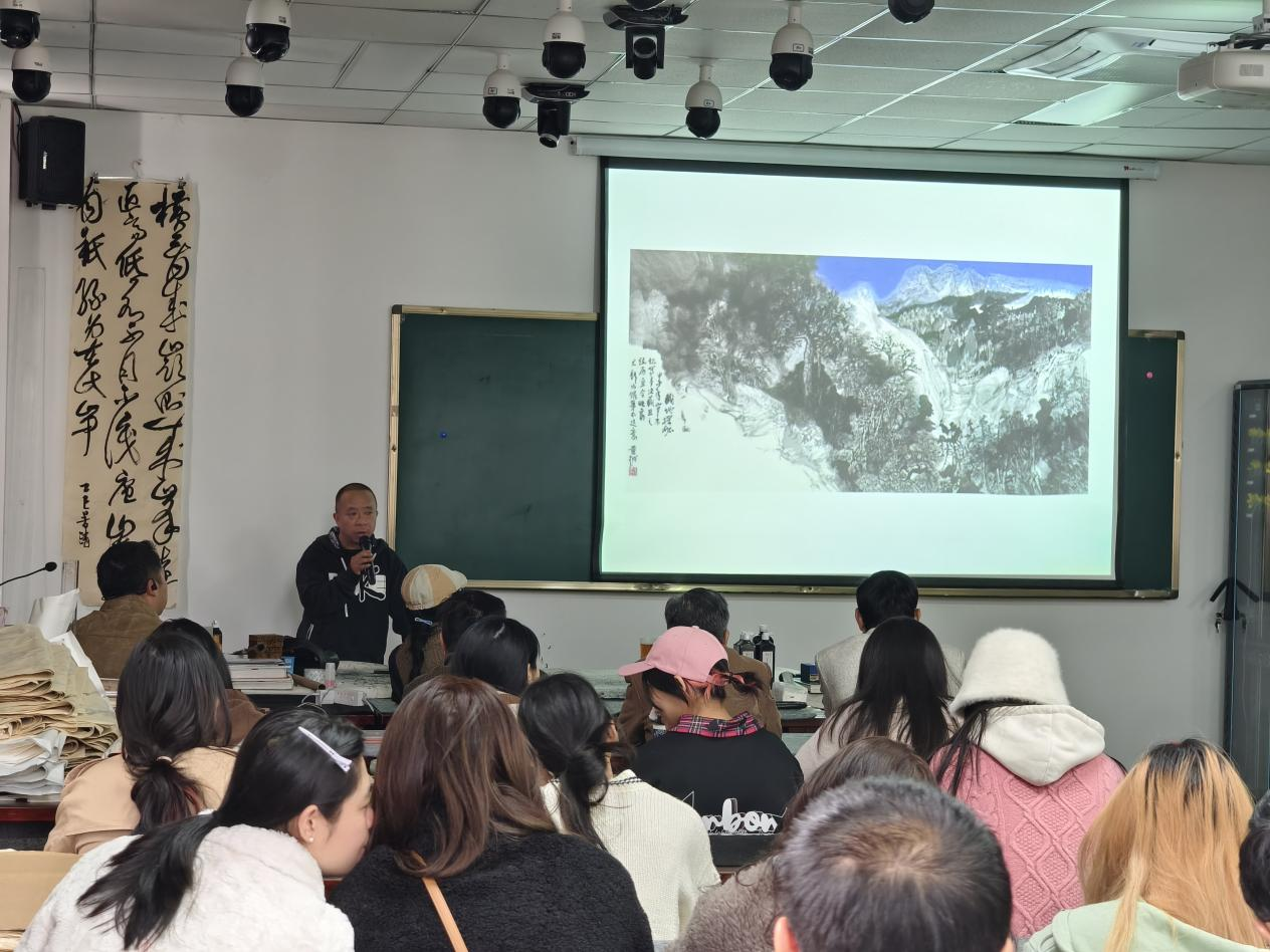 本网讯(文/周允 图/陈弟伦)11月11日下午,美术与设计学院邀请四川美术学院康益教授在学院举办了一场以“水墨画艺术教学与创作”为主题的学术讲座。乐山市美协主席李开能、学院院长熊火花、教研室主任周允及美术学专业部分教师,以及大二、大三学生共同聆听了讲座。讲座由熊火花院长主持。