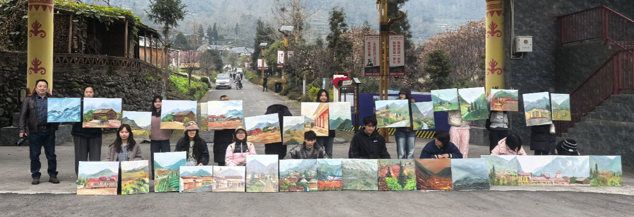 此次富有意义的艺术实践由乐山市人大牵头,乐山大佛旅投集团承办。行前,美术与设计学院院长熊火花及学院党委副书记赵元分别为同学们做了动员宣讲,强调了深入生活、扎根人民对于艺术创作的重要性,并鼓励大家用专业所学服务地方发展。同学们的写生作品在绘制现场就得到了彝族老乡们的一致赞赏和肯定。
