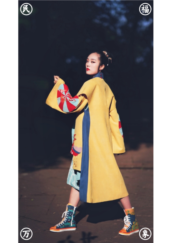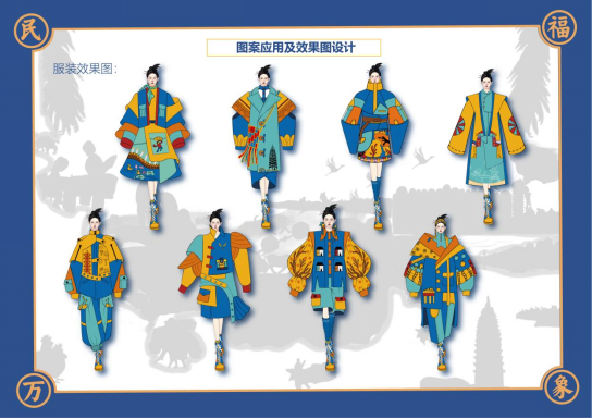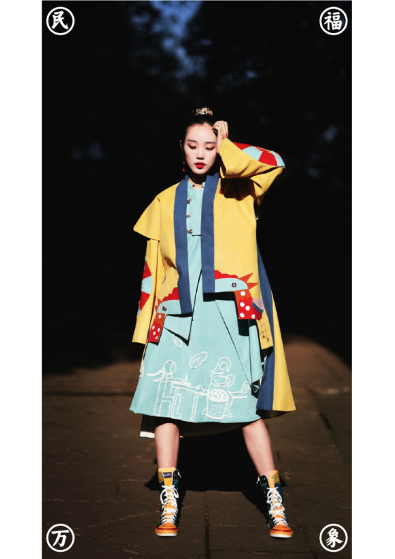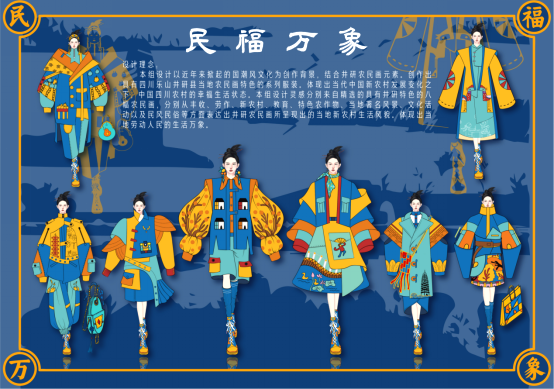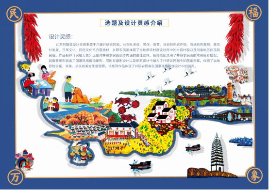 此系列服装设计灵感来源于八幅井研农民画。分别从丰收、劳作、教育、当地特色农作物、当地特色景观、新农村发展、日常文化、民俗文化八方面选材,并研农民画体现了当地新农村建设过程中的村容村貌以及川渝地区的民风民俗。作品名称《民福万象》正是对井研农民画创作内涵的最佳诠释。色彩搭配选用了井研农民画的常用色彩搭配。其服装廓形借鉴了国潮风格服饰廊形,同时在廓形设计以及细节设计中融入了井研农民画中的图案元素。体现了当地百姓求富、求美、求乐的美好生活愿景。该系列作品体现了并研农民画在国潮风格服饰设计中的运用。