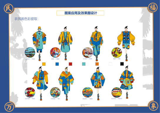 设计理念:本组设计以近年来掀起的国潮风文化为创作背景,结合井研农民画元素。创作出具有四川乐山井研县当地农民画特色的系列服装。体现出当代中国新农村发展变化之下,中国四川农村的幸福生活状态。本组设计灵感分别来自精选的具有井研特色的幅农民画,分别从丰收、劳作、新农村、教育、特色农作物、当地著名风景、文化动以及民风民俗等方面表达出井研农民画所呈现出的当地新农村生活风貌。体现出当地劳动人民的生活万象。